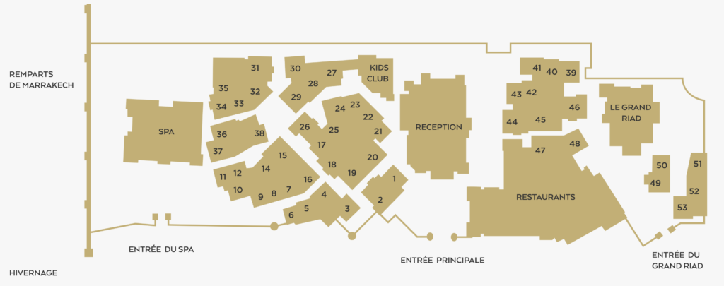 - 53 individual riads ranging from 1- to 4-bedroom units, each with private living areas, patios, rooftop terraces, and often plunge pools. Royal Mansour